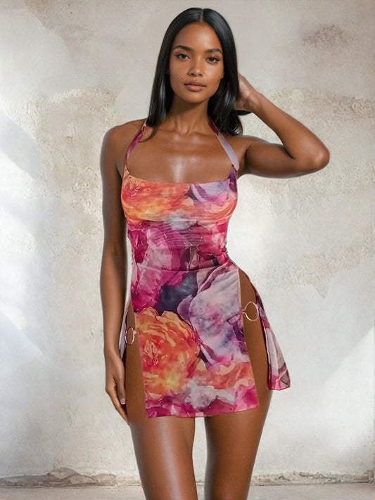 Vestido mini con estampado abstracto y aberturas lisas