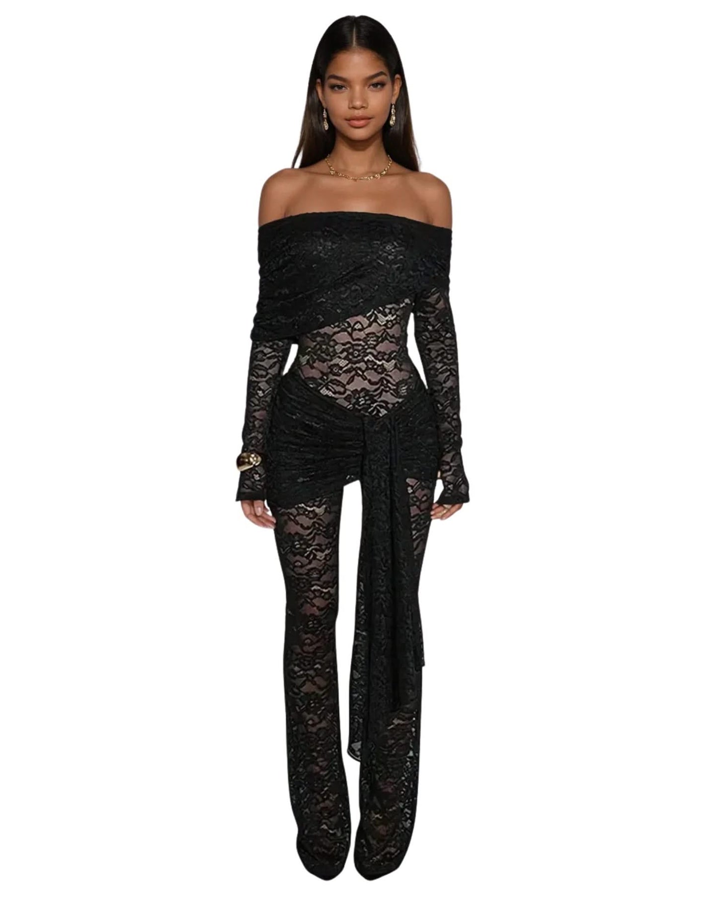 Sumérgete en la elegancia con el mono de encaje negro Kat , la prenda definitiva para tu próxima salida nocturna o evento especial. Con su cautivador diseño de hombros descubiertos y sus intrincados detalles de encaje, este mono combina sofisticación y estilo a la perfección. Ya sea que deslumbres en un cóctel o atraigas todas las miradas en una gala, este conjunto es tu boleto a momentos inolvidables.