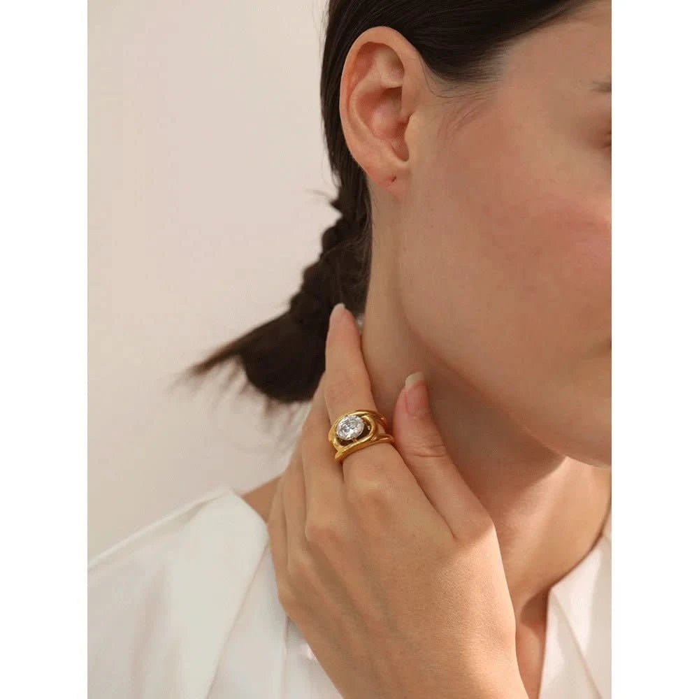 Introducing the Radiant Elegance Gold Ring, an exquisite blend of artistry and sophistication. Designed to captivate, this ring features a stunning oval-shaped clear gemstone, reminiscent of timeless beauty and modern charm. The unique intertwined double-band design adds a contemporary flair while ensuring unparalleled elegance. Perfect as an engagement ring or a striking statement piece, this ring speaks volumes about style and commitment.