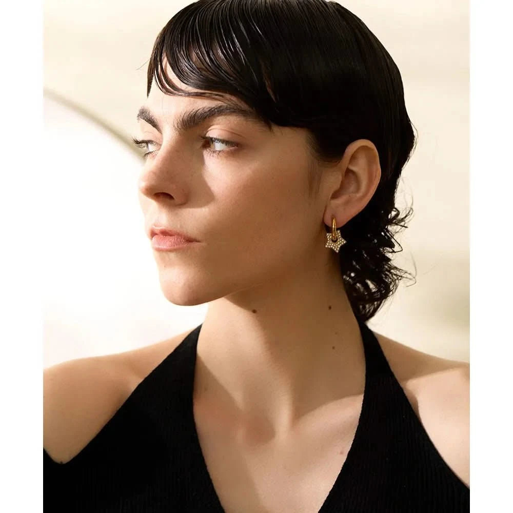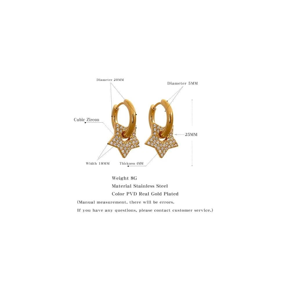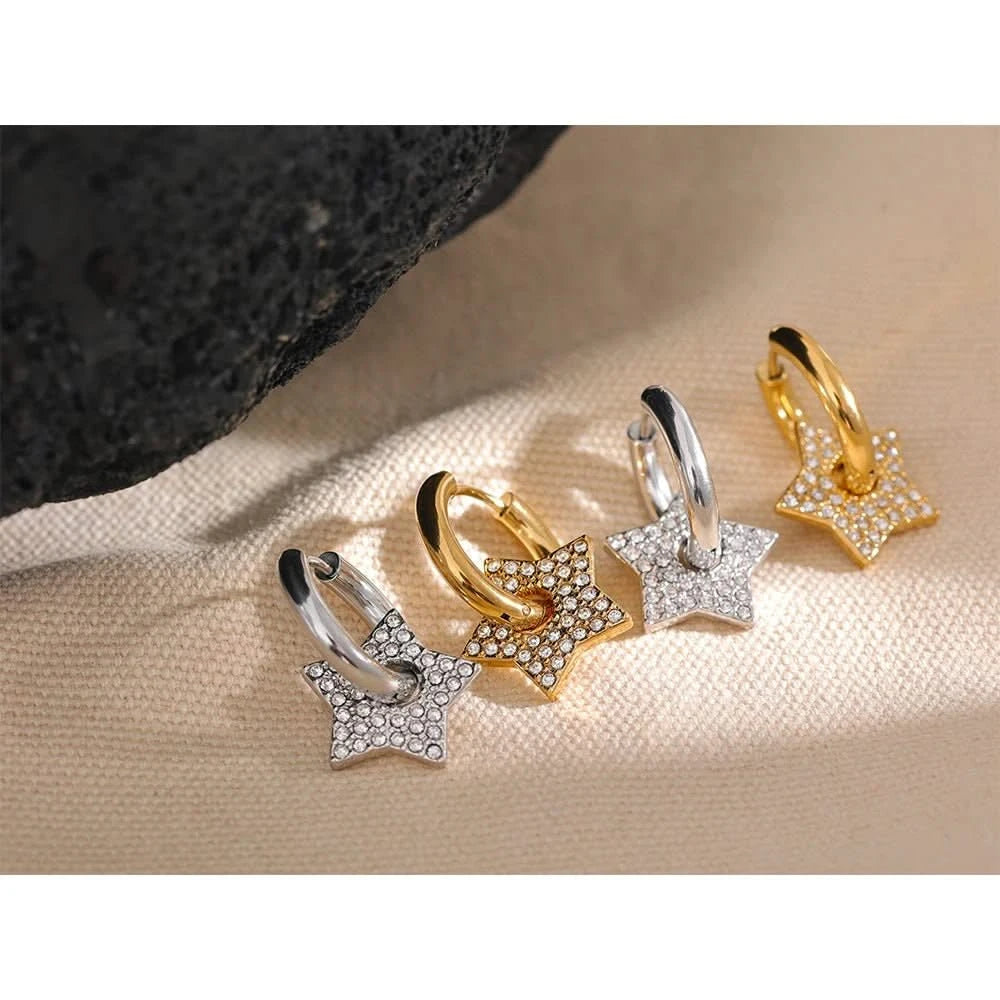 Elevate your jewelry collection with the Starry Dangle Earrings, a celestial-inspired masterpiece that radiates elegance and charm. These stunning earrings feature delicate star-shaped pendants, each encrusted with brilliant cubic zirconia gemstones, creating a dazzling, twinkling effect. The polished stainless steel hoops, plated with PVD real gold, add a luxurious touch, making these earrings the perfect statement piece for any occasion.