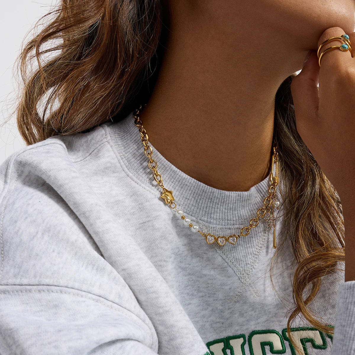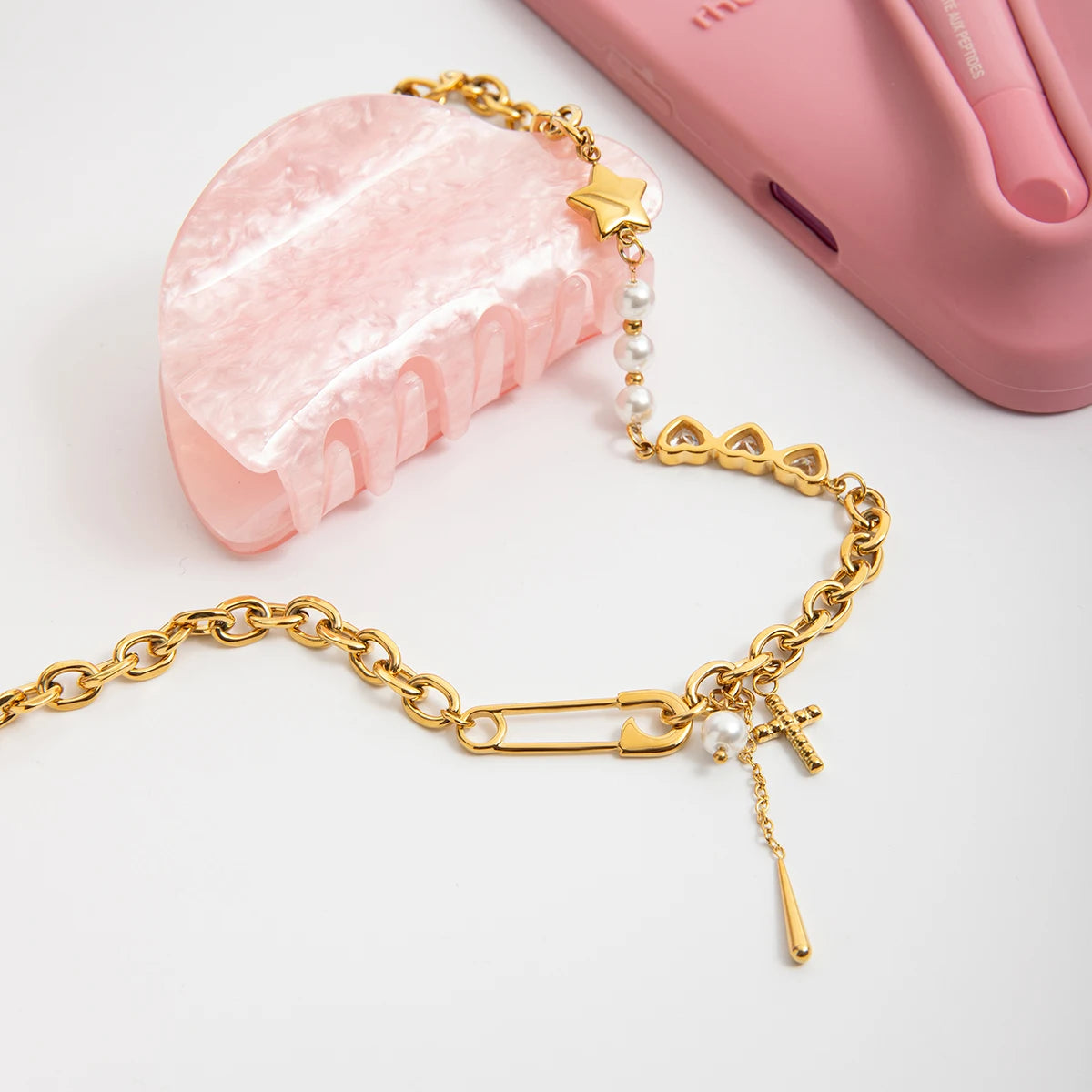 Y2K Patchwork Chain Necklace - Stainless Steel Paperclip & Pentagram Cross with Zirconia
